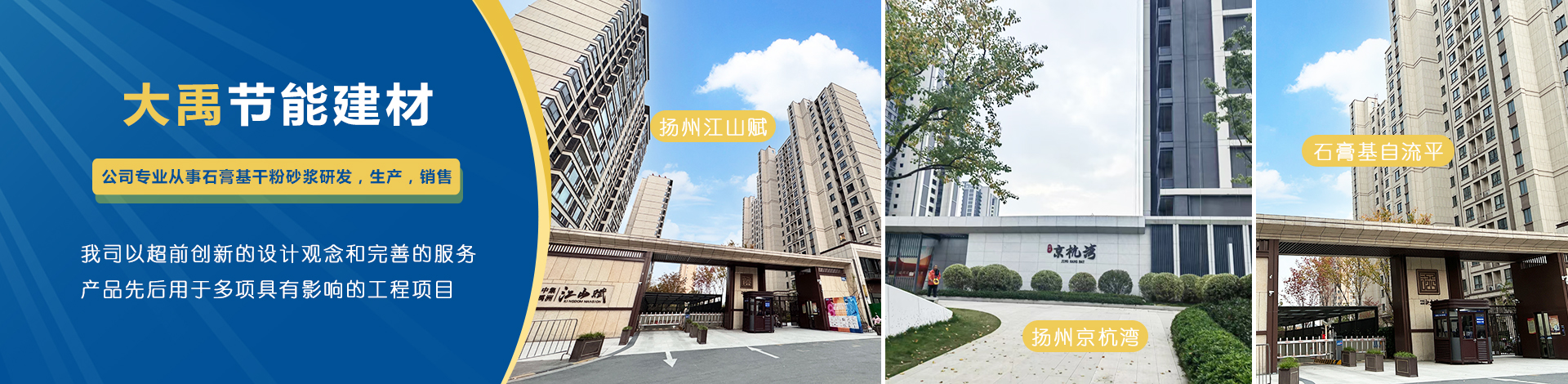 揚州市大禹節能建材科技有限公司成立于2005年9月,位于聯合國宜居城市---江蘇省揚州市,地處江都經濟開發區,與揚、鎮、泰三市接壤,交通十分便捷。公司是專業從事石膏基干粉砂漿研發,生產,銷售一體化的綜合性科技型企業,為國家標準GB/T2862-2012《抹灰石膏》的參編單位?! 」緭碛袊鴥纫涣鞯奶胤N砂漿生產線,并配有各種先進的檢測儀器,年生產能力可達10萬噸。各崗位管理及技術人員齊備,對產品···